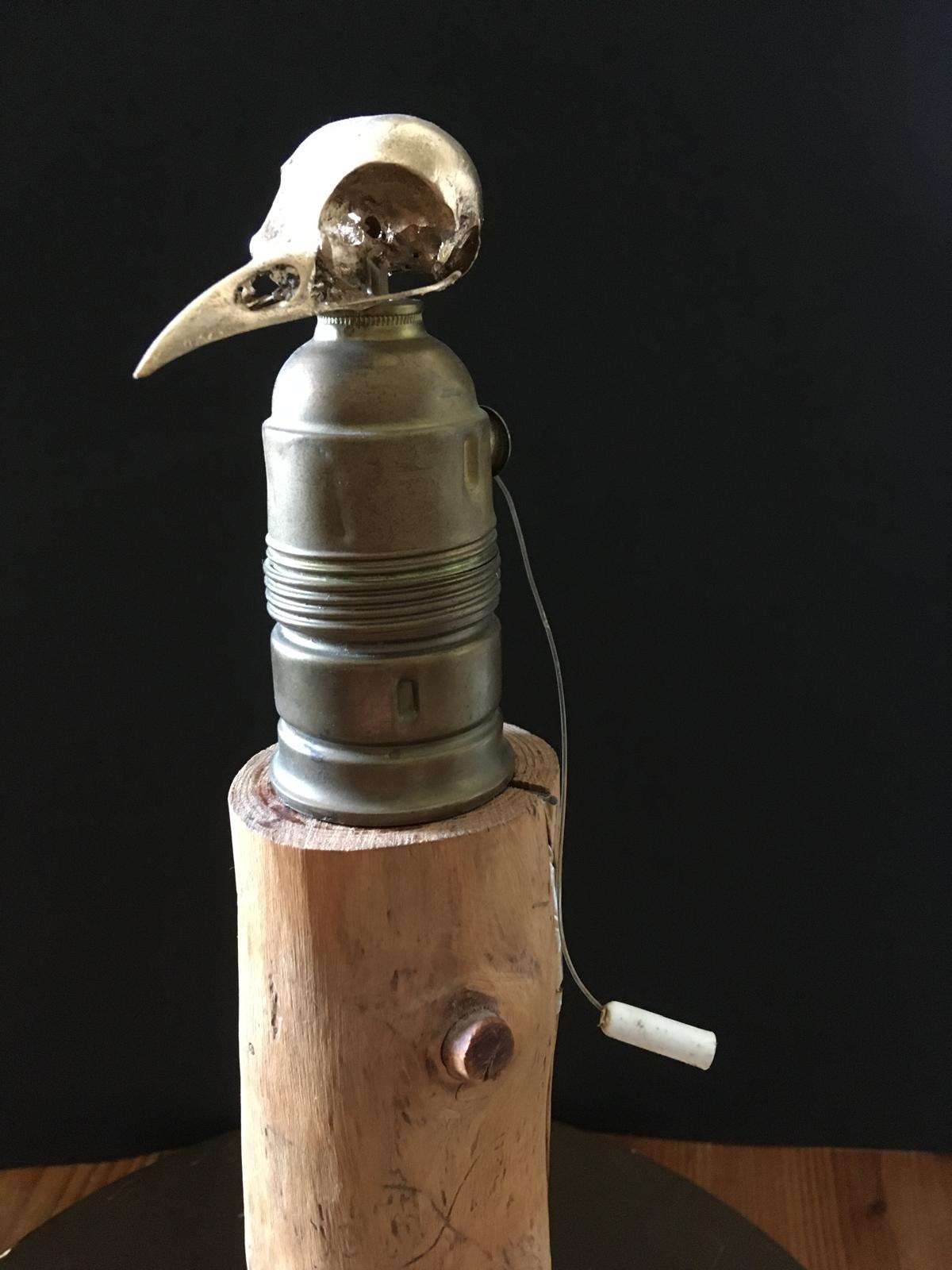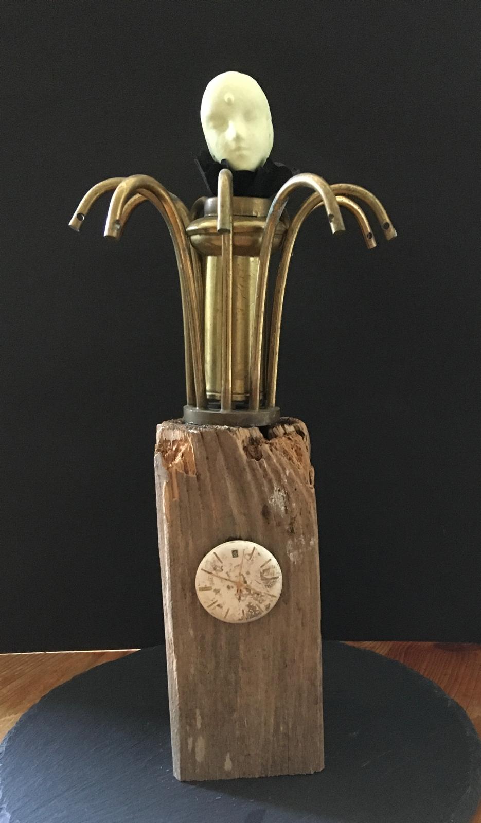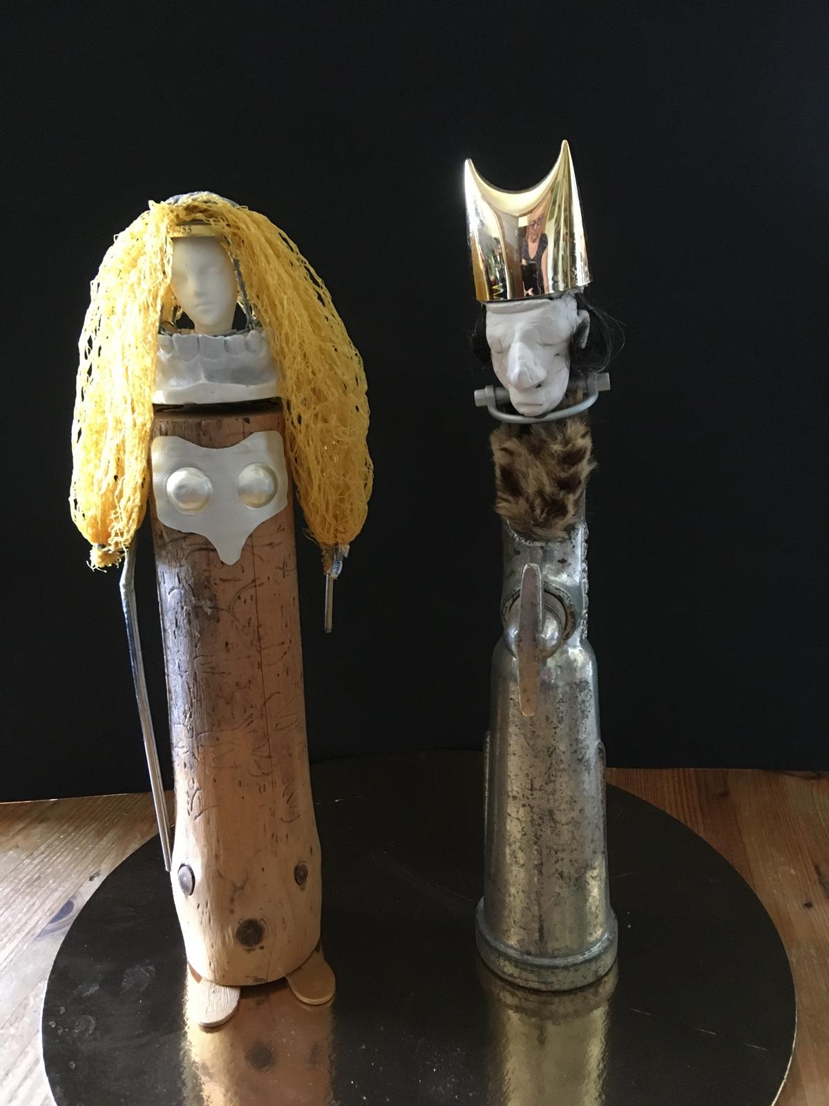 Die Skulpturen von Silke Haller zeichnen sich durch eine Vielzahl von verschiedenen Materialien wie Stein, Knochen, Papier, Leder, Plastik und anderen Fundstücken aus.